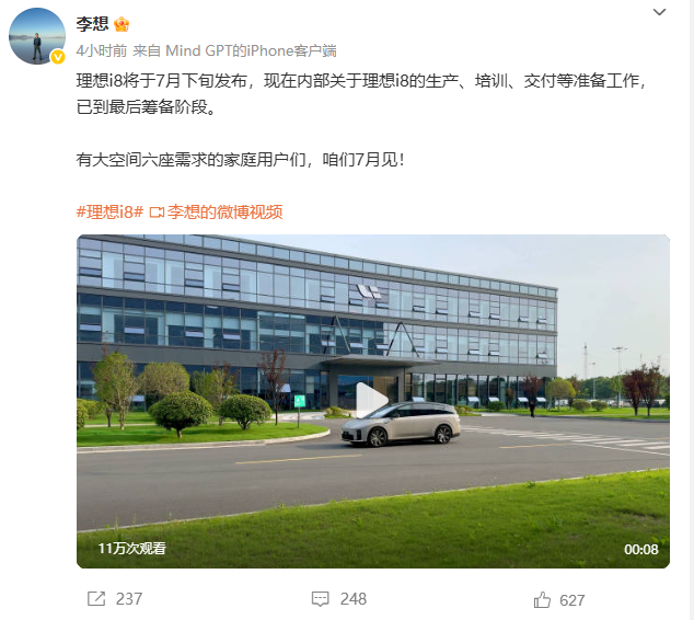数小时前,李想在个人账号分享了一段8秒的视频,内容为理想i8实车动态实拍,并附文官宣,新车将在7月下旬发布。
